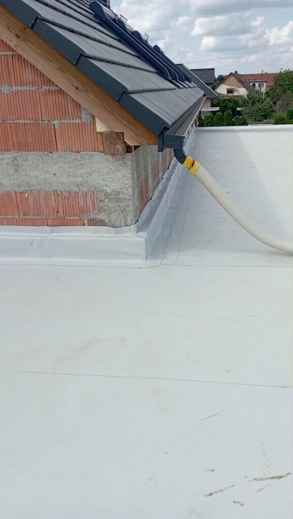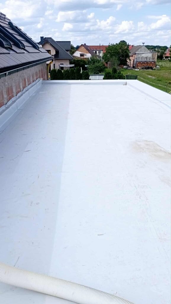 Realizacje dachów płaskich z membrany PVC/TPO oraz papy termozgrzewalnej na halach, domach i garażach.